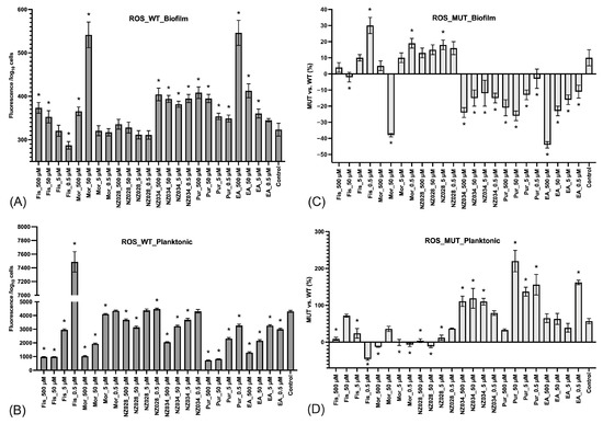 Levels of ROS experienced by the adhered cells (biofilm, panel (A)) and non-adherent cells (planktonic, panel (B)) of the wild-type E. coli strains exposed to different non-lethal concentrations of the selected molecules. The data represent the mean ± standard deviation of independent measurements. Panels (C) and (D) present a comparison of ROS levels between the wild-type (WT) and the WrbA-deprived mutant (MUT). This comparison was obtained by calculating the percentage decrease (indicated by negative values) or increase (indicated by positive values) in the ROS levels relative to their respective WT groups. The data presented represent the mean ± standard deviation obtained from independent measurements. The asterisks indicate statistically significant differences (Tukey’s HSD, p ≤ 0.05) from the control samples.