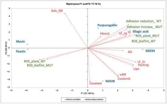 Principal component analyses (PCA) on the data matrix comprising both the microbiological data at the lowest concentration of 0.5 μM and the terms contributing to the ligand-binding free energy on WrbA. The biplot illustrated the distribution of the selected compounds in relation to the characteristic variables.