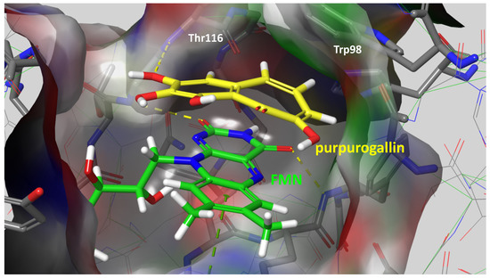 Given the compelling evidence of WrbA’s role in biofilm formation [24,25] and the proven antibiofilm properties of molecules interacting with and modulating WrbA’s function, we hypothesized that leveraging the WrbA scaffold could represent a valuable target for selecting antibiofilm compounds at non-lethal concentrations. To achieve our objective, we accomplished a virtual screening of 800,000 natural compounds, using the WrbA scaffold as the target, to identify potential antibiofilm agents that meet the criteria of being commercially available and having safe toxicological profiles. Using the aforementioned computational procedure, five compounds were identified: Fisetin, morin, purpurogallin, NZ028, and NZ034, along with ellagic acid used as a reference molecule. Ellagic acid has been previously shown to rely on WrbA modulation for its antibiofilm activity [26]. Therefore, ellagic acid was used as a benchmark to assess the ability of WrbA in selecting promising antibiofilm compounds. All of the selected compounds displayed binding modes on WrbA that were strictly related to the one predicted for the ellagic acid [26]. In particular, these compounds share the presence of fused planar rings capable of forming π-π stacking with the flavin mononucleotide (FMN) in complex with WrbA. This interaction allows them to effectively occupy the enzyme’s catalytic site. As an example, in Figure 6, the binding mode predicted for purpurogallin is reported. Notably, the seven-member ring of purpurogallin engages in π–π interactions with Trp98 of WrbA, while one of the phenolic OH groups forms a hydrogen bond with the backbone atoms of Thr116.