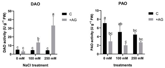 DAO and PAO activities in AG-treated tomato roots with and without salt stress (100 and 250 mM NaCl). Data of enzyme activities are the mean ± SD of three biological replicates. Different letters denote significant differences, two-way ANOVA, following Tukey’s post hoc test p = 0.05.