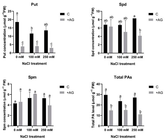 Free polyamine contents of control and AG-treated tomato roots with and without NaCl treatment (100 and 250 mM). Data of PA contents are the mean ± SD of three biological replicates. Different letters denote significant differences, two-way ANOVA, following Tukey’s post hoc test p = 0.05.