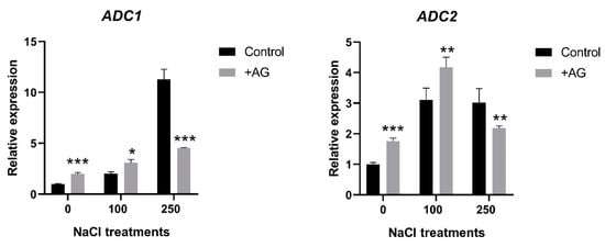 In order to study the effect of AG on the activity of genes implicated in the biosynthesis of PAs, transcript levels of ADC1 and ADC2 genes encoding arginine decarboxylase, and ODC1 coding for ornithine decarboxylase were determined. Both ADC1 and ADC2 were induced by salt, to different degrees. ADC1 transcript levels were 2 and 12 times higher in 100 mM and 250 mM NaCl-treated roots, respectively. AG treatment slightly enhanced ADC1 expression in control roots and in the presence of 100 mM NaCl (two and three times, respectively), whereas it reduced ADC1 expression by 60% compared to its 250 mM NaCl-treated control when stronger salt stress was applied. ADC2 expression was increased three-fold in salt-treated roots. AG slightly enhanced ADC2 transcription in control and 100 mM NaCl-treated roots (1.75- and 4.1-fold, respectively), whereas expression of this gene was slightly reduced only by 28% with AG at stronger salt stress (Figure 3). ODC1 expression was 1.5-fold increased by AG treatment in roots treated with no or 100 mM NaCl, but it was reduced by 250 mM NaCl with or without AG (Figure S1).