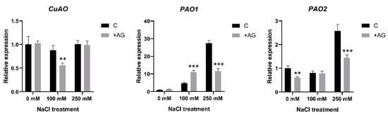 Expression of CuAO and PAO genes of control and AG-treated tomato roots with and without NaCl treatment. Relative expression levels are shown as in Figure 3. Data of each bar are the mean ± SD of three biological replicates. Asterisks denote significant differences from untreated control, Student t test, ** p < 0.01, *** p < 0.001.