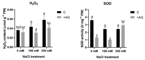 H2O2 contents and SOD activities of control and AG-treated tomato roots with and without NaCl treatment. Data of each bar are the mean ± SD of three biological replicates. Different letters denote significant differences (two-way ANOVA, Tukey’s post hoc test p = 0.05).