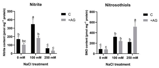 Nitrite and S-nitrosothiol contents of control and AG-treated tomato roots with and without NaCl treatment. Data of each bar are the mean ± SD of three biological replicates. Different letters denote significant differences (two-way ANOVA, Tukey’s post hoc test p = 0.05).