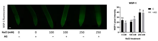 Detection of hydrogen sulfide in control and AG-treated tomato root apices with and without NaCl treatment (100 and 250 mM). Hydrogen sulfide content was measured using a fluorescence probe WSP-1 (Washington State Probe-1) (scale bar: 100 µm) and expressed as pixel intensity. WSP-1 fluorescence was measured at 500 µm away from the root tips and averaged. Bars indicate ±SE of measurements performed with at least 10 seedlings per each treatment, different letters denote significant differences (two-way ANOVA, following Tukey’s post hoc test p = 0.05).