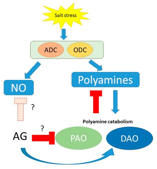 Schematic presentation of potential mechanisms of the effect of AG on PA metabolism and related pathways during short-term salt-stress response to different NaCl concentrations (100 and 250 mM). Question marks indicate the questionable functions of AG during stress, as it can act as an inhibitor of NO synthesis or could induce the expression of PAO genes; however, these functions need to be studied.