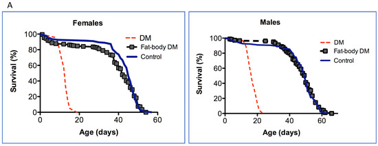 The fat body is a tissue that mediates the immune response in Drosophila and where immunity-related genes (IRG) are produced in response to systemic infections, as well as during aging due to unknown stimuli [18,38,39,40,41,42,43,44,45]. The Drosophila fat body, the fly equivalent of adipose tissue and liver in mammals, is one of the major sites of inducible AMP production and has been shown to play an important role in modulating longevity [29,46]. Surprisingly, the fat-body-specific under-expression of mitochondrial dPrxs had little to no effect on the life span (Figure 1A). One plausible explanation for this finding is that the fat body tissue is more resistant to oxidative insult caused by mitochondrial dPrxs under-expression. Indeed, in our previous study, we found increased apoptosis in the cardia, muscles, and gut epithelia but not fat bodies [23].