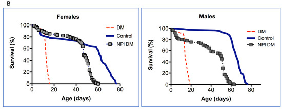 The effect of under-expression of mitochondrial dPrxs in the fat body (A) and in the midgut (B) on the life span of flies. dPrx3 was under-expressed in the dprx5 null background using the inducible S106-pSwitch-GAL4 (fat body) and NP1-GAL4 (midgut) drivers. For comparison, dPrx3 was under-expressed globally with the Da-Gal4 driver (DM, red dotted lines). (A) To activate the gene switch-inducible driver, S106 DM flies were fed food containing RU486 (experimental, fat-body DM), while control flies were fed food with ethanol (control), as described in Section 2. (B) DM—Double mutant under-expressing dPrx3 globally with Da-GAL4 driver; NP1 DM—double mutant under-expressing dPrx3 in the midgut; Control—NP1-GAL4 driver. Approximately 100–125 flies were used for each fly line in the experiment. Shown are representative data of two independent biological experiments, and similar results were obtained in a replicate experiment. A summary of the data is presented in Table 2. The fly lines and genotypes of the flies are described in detail in Table 1.