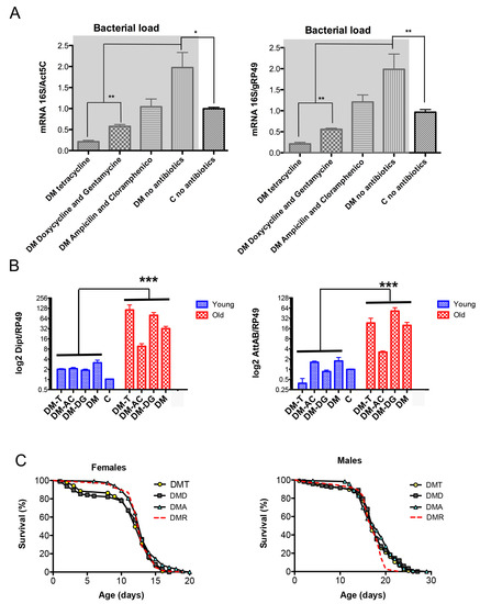 Effects of antibiotics on bacterial load (A), expression of AMPs (B), and life span (C) of the DM flies. Flies were maintained on regular food or food supplemented with tetracycline (T), a combination of ampicillin and chloramphenicol (AC), or a combination of doxycycline and gentamicin (DG). (A) Genomic DNA was isolated from 12-day-old DM and control (C) flies, and total bacterial load was determined using universal 16S rRNA primers. Results are means ± SEM of three replicates performed with two independent cohorts of flies (total n = 6). Results for DM flies with and without antibiotics are highlighted in gray. Asterisks denote statistically significant differences obtained in qPCR analysis (* p < 0.05; ** p < 0.005). (B) RNA was isolated from DM flies of two ages, 5–6 days (physiologically young) and 14–15 days (physiologically old, about 10% of fly death), and from 14-day old control flies (+/Da, dprx5, C), considered physiologically young. Results are means ± SEM of three replicates performed with two independent cohorts of flies (total n = 6). The two-way ANOVA test showed significant differences between physiologically young and old age (*** p < 0.0001). (C) Shown are data from one experiment with approximately 100–125 flies for each line. The results of the biological replicate from an independent cohort are shown in Figure S6. Statistical data are shown in Table S1. The DMs were kept on the standard food (DMR) and food supplemented with tetracycline (DMT), a combination of ampicillin and chloramphenicol (DMA), or a combination of doxycycline and gentamicin (DMD). The log-rank test did not show significant differences between fly groups.