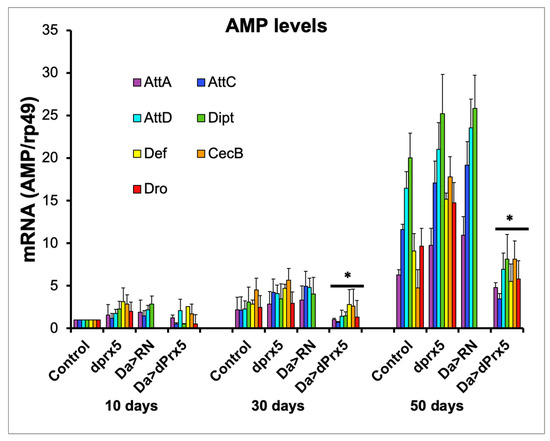 AMP expression in young (10 days), middle-aged (30 days), and old (50 days) flies. AMPs tested were attacins (AttA, AttC, and AttD); defensin (Def); Diptericin (Dipt); drosocin (Dro); and cecropin C (CecC). Level of AMPs in driver control flies, dprx5 mutants (dprx5); and in flies expressing the dPrx5 transgene (Da > dPrx5) or its RN form (Da > RN) in the endogenous gene null background. Signals for each AMP were standardized against signals obtained for rp49 housekeeping gene and plotted on y axis. Results are means ± SEM of three replicates performed with two independent cohorts of flies (total n = 6). Asterisks denote statistically significant differences obtained in RT-PCR analysis between AMP levels in flies overexpressing wild type dPrx5 transgene and flies overexpressing the redox-negative form of dPrx5, dprx5 mutants, and control (* p < 0.05).