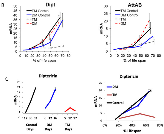 Conversely, since an increase in the bacterial load and hyperactivation of immunity in Drosophila are characteristics of ‘normal’ aging [35,52,53], it has been suggested that bacteria can enhance the age-related induction of immunity-related genes. However, studies that showed that IRG genes were still significantly induced in old flies maintained in a sterile environment or with antibiotics indicate that IRGs respond to signals not directly associated with microbes [38,40]. We also observed a significant induction of AMPs in physiologically old DM flies regardless of the presence of antibiotics (Figure 4B), suggesting a response to abiotic stimuli rather than to intestinal microbial content. Thus, another important finding of our study is that the development of hyperactive humoral immunity in the DM is a response to abiotic signals that likely originate in mitochondria rather than increase in the microbial content. Our previous finding that the age-related increase in AMP levels is not triggered via canonical immune pathways but responds to age-related endogenous changes, such as increased ROS production by mitochondria, supports this view [54]. However, these changes in microbial load did not cause any effects on life span (Figure 4C). We have yet to explore the potential effects on the commensal microbiota and changes in the gut microbiome that are implicated in healthy intestinal functioning and reduced pro-inflammatory signaling [55].