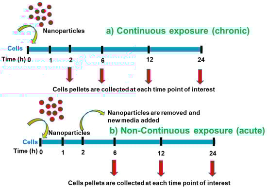 Two different exposure conditions were considered, continuous exposure (chronic) and the non-continuous exposure (acute) of Au-Tf (6 nM) nanoparticles, as shown in Figure 2. For the continuous exposure, nanoparticles were continuously exposed to cells without removing the nanoparticles and replenishing the media. For the non-continuous exposure, cells were exposed to nanoparticles for 2 h, after which they were removed, and the cells were replenished with fresh serum-free media containing no nanoparticles. These cells were then grown for an additional 4–22 h.