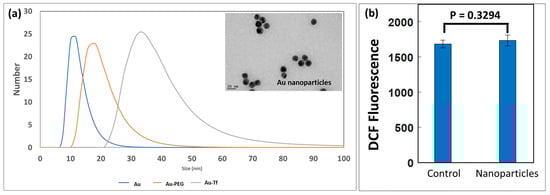 (a) DLS data showing number versus size distribution for Au, Au-PEG, and Au-Tf nanoparticles. Transmission electron microscopy (inset) indicated an Au nanoparticle diameter of ~18 nm; (b) ROS data measured by the DCFCDA assay indicated a slight ROS increase in cells after 2 h exposure to nanoparticles, although it was not significant.
