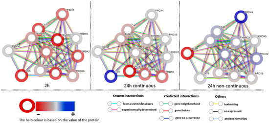 Table 1 shows that at 2 h exposure, all detected proteins were downregulated with glutathione reductase (GR) and glutathione peroxidase (GPX) proteins showing significance. Both of these proteins are crucial for the proper functioning of the glutathione thioredoxin system. Hence, it can be interpreted that the glutathione thioredoxin pathway is hindered at 2 h exposure. At 24 h continuous exposure, all detected proteins show probability of downregulation except for the GSS protein. Both peroxiredoxin 1 (PRDX 1) and peroxiredoxin 3 (PRDX 3) proteins were significant and their overexpression in prostate cancer has been proposed to be linked to cancer initiation and progression [41,68]. Peroxiredoxin 3 (PRDX 3) overexpression has been demonstrated to counteract senescence and promote tumor survival in prostate cancer [69]. The peroxiredoxin proteins help in detoxifying peroxides and peroxynitrite derivatives in cells [70]. In 24 h continuous exposure, two of the peroxiredoxin proteins were significantly downregulated and, therefore, the glutathione thioredoxin pathway could be affected to some extent in this condition. At 24 h non-continuous exposure, most proteins were measured to be upregulated, while five other proteins showed a probability of being downregulated. Among the upregulated proteins, the peroxiredoxin 4 (PRDX 4) protein was significantly upregulated and has been demonstrated to play a critical role in prostate cancer cell growth and radioresistance [71]. While many proteins when considered individually are not significantly different, pathway analysis assesses the inter-relation and dependance of each protein within a pathway to determine their collective effect. These observations are visualized by the STRING analysis network shown in Figure 4.