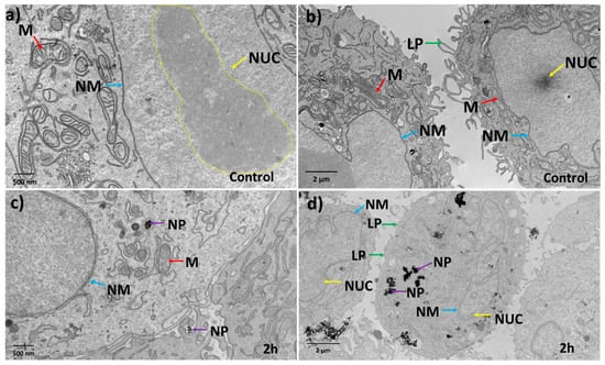 Transmission electron microscopy (TEM) has been indispensable for studying the ultrastructural morphological changes occurring within cells. Fine details of intracellular structures can be visualized and monitored for changes to understand the effect of nanomedicines administered on the health and survival of cells [72,73] linked to oxidative stress. TEM images were used to study the effect of nanoparticles on the morphological attributes of the PC-3 cells for all exposure conditions (representative images given in Figure 5 and Figure 6). Figure 5a,b shows control cells have intact nuclear membranes with well-arranged pores. The nucleolus was confined in a defined region within the nucleus, and the DNA can be seen as a graded darker structure within the nucleolus. The control cells also have well-defined lamellipodial structures that are crucial for cell migration (green arrows). The mitochondria were observed as elongated structures with intact cristae (blue arrows).