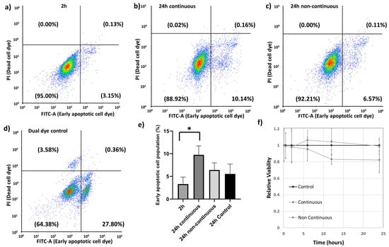 Annexin V early apoptosis measurement assay (a) 2 h exposure, (b) 24 h continuous exposure, (c) 24 h non-continuous exposure, (d) dual dye control for determining the different populations, (e) comparison of early apoptotic cell populations between different exposure conditions, (f) Relative viability for each condition using trypan blue assay; *—Significance p < 0.05 (Two paired students t-test).