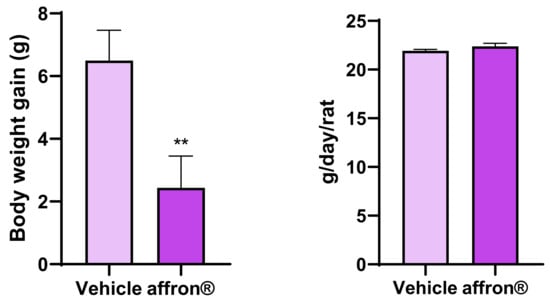 Body weight gain and daily food intake of rats administered with vehicle or affron® for one week. Data are represented as the mean ± SEM. ** p < 0.01 vs. vehicle.