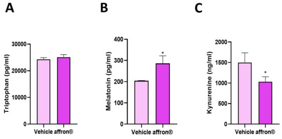 Serum levels of (A) tryptophan (pg/mL), (B) melatonin (pg/mL), and (C) kynurenine (ng/mL) in rats administered with vehicle or affron® for one week. Data are represented as the mean ± SEM. * p < 0.05 vs. vehicle.