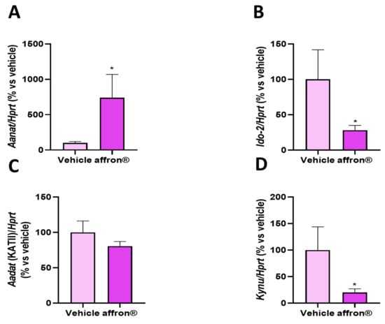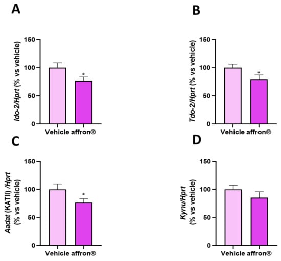Figure 5 shows the mRNA levels of (A) indoleamine 2,3-dioxygenase 2 (Ido-2), (B) Tryptophan-2,3-dioxygenase 2 (TDO-2), (C) aminoadipate aminotransferase (Aadat), and (D) kynureinase (Kynu) in the liver of rats administered with vehicle or affron® for one week. The treatment did not modify the hepatic gene expression of Kynu but it significantly downregulated the gene expression of the two enzymes involved in the conversion of tryptophan into kynurenine Ido-2 and Tod-2 (p < 0.05 for both), as well as the gene expression of Aadat, which transforms kynurenine into KA.