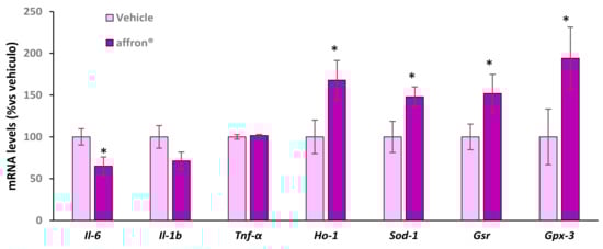 Rats administered with affron® did not show any differences in the hepatic gene expression of Il-6 and Sod-1 compared to rats administered with vehicle. However, the treatment significantly downregulated the gene expression of Il-1β and Tnf-α (p < 0.05 for both) and induced overexpression of Ho-1, Gsr, and Gpx-3 (p < 0.05 for all) in the liver.