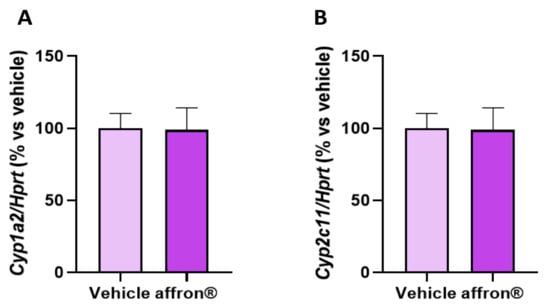 mRNA levels determined using qRT-PCR of (A) cytochrome P450 1A2 (Cyp1a2) and (B) cytochrome P450 2C11 (Cyp2c11) in the liver of rats administered with vehicle or affron® for one week. Data are represented as the mean ± SEM.