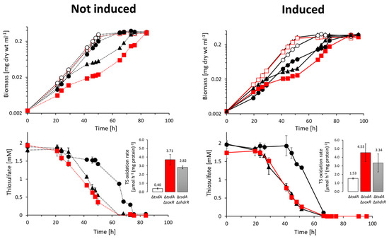 Growth and thiosulfate consumption of H. denitrificans ΔtsdA (black circles and lines), ΔtsdA ΔshdrR (black triangles and lines), and ΔtsdA ΔsoxR (red boxes and lines). All strains were grown in medium containing 24.4 mM methanol, either in the absence (open symbols) or in the presence of 2 mM thiosulfate (filled symbols). Pre-cultures contained either no thiosulfate (not induced, broken lines) or 2 mM thiosulfate (induced, solid lines). Thiosulfate concentrations for the different cultures are depicted in the lower panels. Symbol assignments and the color code for specific thiosulfate (TS) oxidation rates are the same as in the upper panels. Error bars indicating SD are too small to be visible for the determination of biomass.