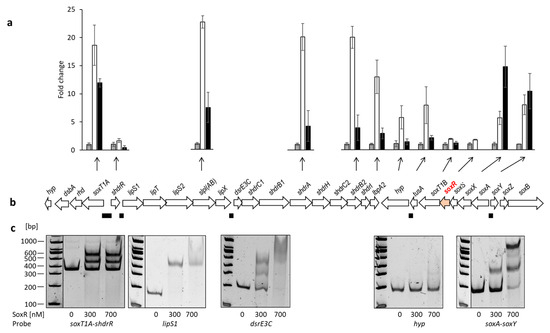 (a) Relative mRNA levels of twelve genes located in the shdr–sox genetic region (depicted in panel; (b)) from H. denitrificans for the ΔtsdA reference strain in the absence (gray columns) and presence of thiosulfate (white columns), as assessed by RT-qPCR. Results for H. denitrificans ΔtsdA ΔsoxR are shown by black columns. Results were adjusted using H. denitrifcans rpoB, which encodes the β-subunit of RNA polymerase, as an endogenous reference, according to [42]. (b) DNA regions tested in EMSA assays for SoxR binding are indicated as black rectangles below the hyphomicrobial shdr–sox genes. The soxR gene is highlighted in red for easier orientation. Fragment sizes: 362 bp for the soxT1A–shdrR intergenic region, 177 bp and 173 bp for the regions upstream of lipS1 and dsrE3C, respectively. The fragments downstream of tusA and between soxA and soxY had sizes of 176 bp and 151 bp, respectively; (c) EMSA analysis of Strep-tagged SoxR with upstream promoter sequence probes of sulfur oxidation-related genes as specified in (b). DNA probes of 17 nM were incubated with different amounts of SoxR (300 and 700 nM). Vertical lines separate samples that were run on the same gel but were not directly adjacent.