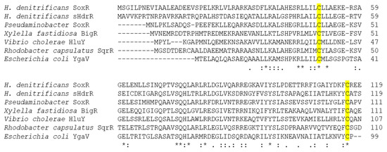 Amino sequence alignment of SoxR homologs. Accession numbers/locus tags and references in the order of appearance: (Hden_0700 [8], Hden_0682 [8,9], WP_010893290 [34], HLYU_VIBCH [65], WP_019171658 [27], ADE85198 [35], and b2667 [66]). An * (asterisk) indicates positions which have a single, fully conserved residue. Conserved cysteine residues are highlighted in yellow. Colons (:) and single dots (.) indicate conserved and semi-conserved amino acids, respectively.