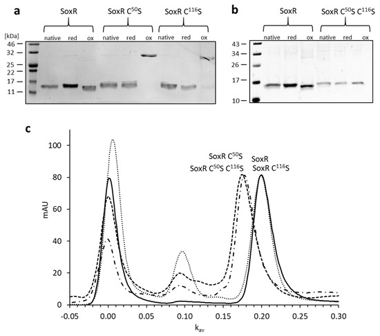 We sought to obtain information about the oligomerization state and conformation of SoxR as well as about the reactivity of the two cysteine residues. To this end, Strep-tagged SoxR as well as variants with serine in place of either one (SoxR Cys50Ser and SoxR Cys116Ser) or both cysteines (SoxR Cys50Ser Cys116Ser) were overexpressed in E. coli, purified by affinity chromatography, and subjected to reducing and non-reducing SDS–PAGE analysis in the as-isolated state, after reduction with DTT, and after oxidation with CuCl2. The same single 15 kDa band was obtained in all cases under reducing conditions (not shown). The band for the oxidized wild-type protein migrated slightly further than those for the as-isolate and reduced proteins under non-reducing conditions (Figure 6a), indicating a more compact structure due to the formation of an intramolecular disulfide bond between Cys50 and Cys116. The oxidized SoxR Cys50Ser and SoxR Cys116Ser variants formed intermolecular dimers connected by the remaining cysteine on each of the monomers (Figure 6a). These observations indicated a homodimeric state for the native proteins that allows close contact between the Cys50 and Cys116 residues, respectively, of the monomers and thus the formation of disulfide bridges under oxidizing conditions.