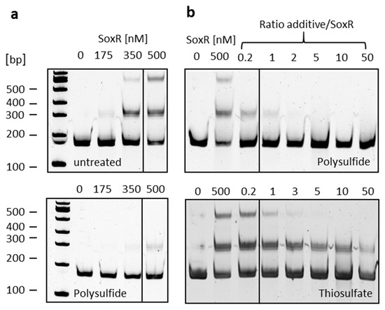 In the next step, EMSA assays were performed that allowed more detailed insights into the binding capacity of SoxR to the intergenic region between the divergently oriented soxXA and soxYZB genes (Figure 7). SoxR binds to the DNA probe in a concentration-dependent manner and leads to the appearance of two shifted bands indicating two different binding sites (Figure 7a, upper panel). As related proteins respond to persulfuration [35,64], we tested the response of SoxR to treatment with polysulfide, oxidized and reduced glutathione (GSH and GSSG), tetrathionate, sulfite, and thiosulfate in various molar ratios of protein and additive. Whereas GSH, GSSG, tetrathionate, and sulfite had no effect even when present in 50-fold excess compared to the protein (not shown), treatment with polysulfide above a molar ratio of 1 completely prevented binding of SoxR to the target DNA, and a shift was no longer observed (Figure 7a, lower panel, and Figure 7b, upper panel). Thiosulfate also had an effect, albeit a much milder one (Figure 7b, lower panel). The second shifted band disappeared at a ratio thiosulfate/SoxR of 5, and the first band still persisted at a ratio of 50, corresponding to a thiosulfate concentration of 0.2 mM. As outlined in the introduction, the initial steps of thiosulfate degradation occur in the periplasm, and it is therefore unlikely that thiosulfate would ever reach concentrations in the cytoplasm that would be required to elicit a response from SoxR.