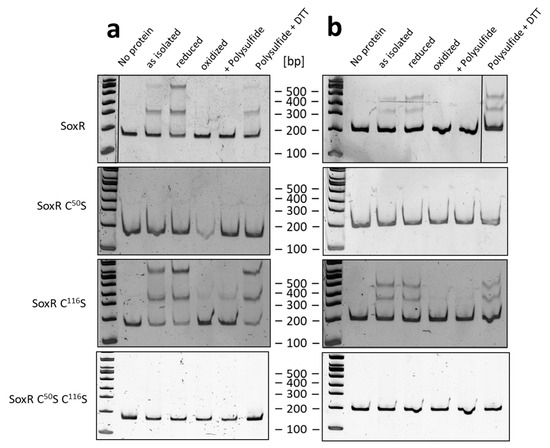 EMSA assays were also performed with the as-isolated, reduced, oxidized, and polysulfide-treated SoxR variants and two different DNA probes (Figure 8). Reduction with DTT led to the same results as those obtained for the untreated proteins, indicating that they are fully reduced upon isolation and remain in this state during storage. Oxidation of wild-type SoxR prevented binding to both tested DNA probes. While the SoxR Cys50Ser variant completely lost its DNA binding ability, the Cys116Ser variant bound effectively to the DNA probes. When polysulfide-treated wild-type SoxR was reduced with DTT in a second step, the protein regained its DNA-binding capacity, demonstrating that the modification caused by polysulfide was fully reversible by reduction. A response to oxidation or incubation with polysulfide was still observed for the Cys116Ser variant, albeit weaker than that of the wild-type protein. This behavior differs significantly from that of the related SqrR from R. capsulatus, where variants lacking one of the two conserved cysteines bind to their target DNA but do not show a loss of affinity upon persulfuration [35]. The SoxR variant lacking both cysteines was unable to bind DNA, regardless of the treatments applied.