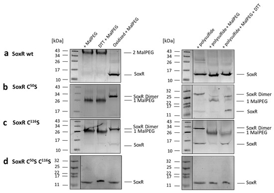 To clarify the chemical nature of the SoxR modifications by polysulfide and oxidation, gel-shift assays were performed using MalPEG, which selectively labels free thiol groups covalently [67]. The modification can be detected by non-reducing SDS–PAGE since the molecular mass of the protein is increased by ~10 kDa per SH group modified. Treatment of the recombinant wild-type SoxR protein with MalPEG resulted in a single 20 kDa band shift, indicating that it contains two free cysteine residues, as expected (Figure 9a). In contrast, oxidized SoxR did not react with MalPEG (Figure 9a), demonstrating the existence of a disulfide bridge between Cys50 and Cys116, as also suggested by non-reducing SDS–PAGE in the absence of MalPEG (Figure 6a). MalPEG labeling of the SoxR variants gave the expected results, with the variants carrying one cysteine showing a single 10 kDa shift (Figure 9b,c) and the double mutated variant not reacting with MalPEG as predicted (Figure 9d). After oxidation, the SoxR Cys50Ser variant produced exclusively dimers connected by Cys116–Cys116 disulfide bridges and not reacting with MalPEG (Figure 9b), whereas the Cys116Ser variant showed incomplete dimerization. This observation is corroborated by the response of SoxR and its variants to polysulfide (Figure 9, right panels). While the wild-type protein stayed essentially monomeric, i.e., disulfide bonds between protein monomers were not formed, the SoxR Cys50Ser variant completely transformed into a dimer stable under denaturing conditions (Figure 9b). The Cys116Ser variant behaved differently, with a substantial fraction staying monomeric (Figure 9c). We note that the dimeric fraction of both variants obtained after treatment with polysulfide turned monomeric after incubation with MalPEG, possibly indicating a (poly)sulfur bridge between the remaining cysteine residues that is susceptible to cleavage by the thiol-binding agent. In conclusion, Cys50 residues appear less prone to reaction than Cys116 residues, just as has been reported for the corresponding cysteines in R. capsulatus SqrR [68], and/or they reside further apart from each other in the native SoxR dimer than Cys116 residues.