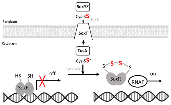 Proposed signal transduction pathway and mode of action of the homodimeric SoxR repressor protein. Established sulfur-binding proteins are printed in black. Sulfane sulfur atoms that come originally from thiosulfate (cf. Figure 1) are highlighted in bold red.