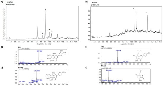 TIC of PMFF isolated from Citrus sinensis (A); MS (B) and MS/MS (C) spectra of NOB. #1, SIN; #2, Hexamethoxyflavone; #3, NOB; #4, Heptamethoxyflavone; #5, TGT. TIC of PFF isolated from Humulus lupulus (D); MS (E) and MS/MS (F) spectra of XTM. #1, 5,7-Di-O-methyl-8-Prenylnaringenin; #2, Ox-XTM; #3, XTM.