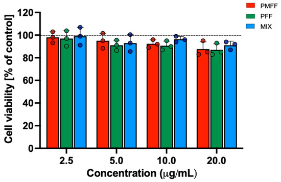 As shown in Figure 2, when compared to control cells, neither treatment with PMFF, nor with PFF nor with MIX significantly affected cell viability in the concentration range tested and for the time period evaluated.