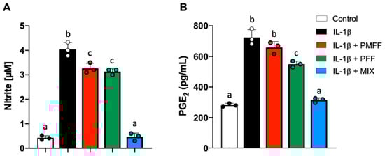 Effect of PMFF, PFF or MIX on NO (A) and PGE2 (B) released from differentiated, IL-1β-activated Caco-2 cells. Values obtained are the mean ± SD of three separate experiments conducted in triplicates. Means with different letters are significantly different with p < 0.05 (one-way Anova with Tukey’s post hoc test).
