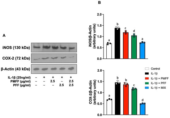 Since MIX treatment strongly decreased NO and PGE2 release from differentiated IL-1β-activated Caco-2 cells, we then investigated whether PMFF or PFF treatment (either individually or in combination) affected iNOS and COX-2 protein levels. To this aim, differentiated Caco-2 cells were either left untreated (control) or stimulated with IL-1β (25 ng/mL) for 24 h. When necessary, cells were preincubated with either PMFF (2.5 μg/mL) or PFF (2.5 μg/mL) or MIX (2.5 μg/mL) for 1 h.