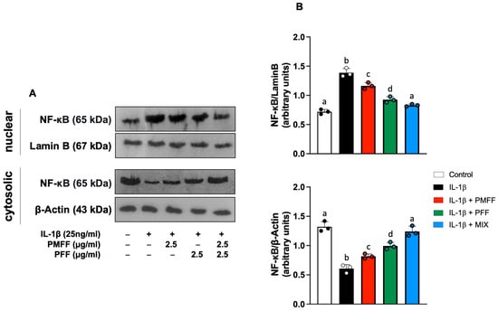 As shown in Figure 5, when compared to control, stimulation with IL-1β resulted in a significant increase in NF-κB nuclear translocation, evident from the increased nuclear levels of p65 and the concomitant reduction in the cytosolic ones (p < 0.001). On the other hand, PMFF or PFF pre-treatment induced a significant reduction in p65 nuclear levels (p < 0.005 and p < 0.001, respectively). Interestingly, MIX preincubation completely inhibited IL-1β-induced p65 nuclear translocation, restoring nuclear and cytosolic protein levels to control ones.