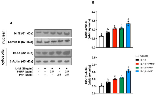 Effect of PMFF, PFF or MIX on either Nrf2 nuclear translocation or cytosolic levels of HO-1 in differentiated, IL-1β-activated Caco-2 cells. Representative images of Western blot analysis (A). Densitometric analysis of either Nrf2 or HO-1 protein levels normalised for laminin b or β actin levels, respectively (B). Values obtained are the mean ± SD of three separate experiments. Means with different letters are significantly different with p < 0.05 (one-way Anova with Tukey’s post hoc test).
