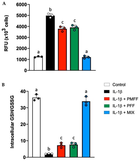 Effect of PMFF, PFF or MIX on IL-1β-induced cellular redox unbalance in activated, differentiated Caco-2 cells. RONs, expressed as relative fluorescence units (RFU), (A) and GSH/GSSG (B). Values obtained are the mean ± SD of three separate experiments in triplicate. Means with different letters are significantly different with p < 0.05 (one-way Anova with Tukey’s post hoc test).