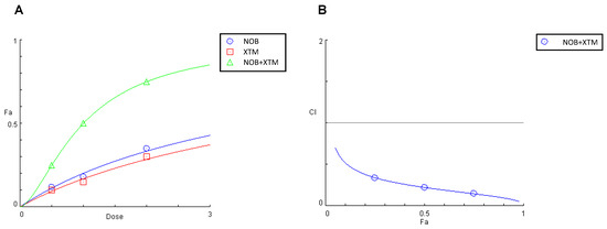 To this aim, we followed the Chou–Talalay Combination Index (CI) model, based on the median effect equation. The CI values for the different inhibition fractions (fa) of RONs production and represented the data as a function of the measured effect (Figure 8B). According to Chou–Talalay, values of CI > 1, CI < 1 and CI = 1 indicate an antagonistic, synergistic or additive effect, respectively. In our study the CI values measured for the release of RONs by IL-1β-stimulated Caco-2 cells, were all far below 1, indicating a synergistic inhibitory effect of NOB and XTM in a wide range of concentrations.