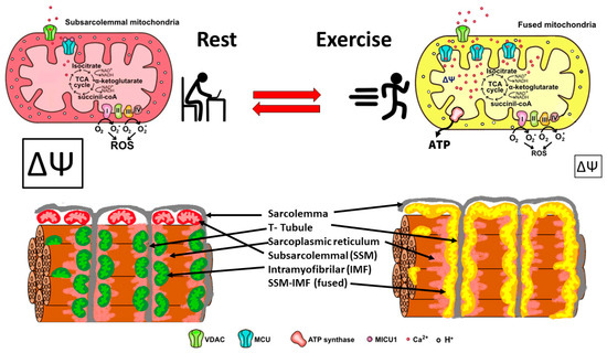 - Eisner, V.; Lenaers, G.; Hajnóczky, G. Mitochondrial Fusion Is Frequent in Skeletal Muscle and Supports Excitation-Contraction Coupling. J. Cell Biol. 2014, 205, 179–195. [Google Scholar] [CrossRef]