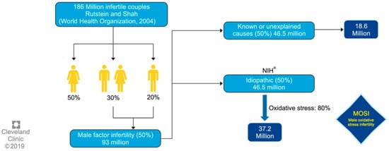 One of the main certainties of male-factor infertility is that it has become one of the major global health problems, currently accounting for 20–30% of infertility cases worldwide. As previously mentioned, idiopathic male infertility accounts for a large majority of cases where the underlying cause(s) remains elusive [,]. In this respect, most of the articles published over the last 10 years show a strong correlation between elevated reactive oxygen species (ROS) levels in semen and worse reproductive outcomes. Therefore, another certainty is that oxidative stress (OS) is currently the most widely accepted mechanism as a key factor in explaining idiopathic MI cases, [] through phenomena such as mitochondrial dysfunction, lipid peroxidation, DNA damage and fragmentation, and finally, sperm apoptosis [,]. Thus, all factors which have been traditionally associated with male infertility and poor sperm quality, such as alcohol, smoking [], obesity, varicocele, infections, and psychological stress may indeed exploit their effect through oxidative stress []. With regard to the latter and having in mind the strong relationship between OS and MI, some authors are currently starting to refer to the category, MOSI (Male Oxidative Stress Infertility) [], as a medical term to describe infertile men with abnormal sperm parameters and oxidative stress (OS), including those previously classified as having idiopathic infertility [].