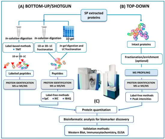 A schematic outline of all the protocols here reviewed in both bottom-up and top-down untargeted MS approaches for the proteomic analysis of human SP. Reproduced with permission from Preianò, M. et al., Int. J. Mol. Sci., 2023.