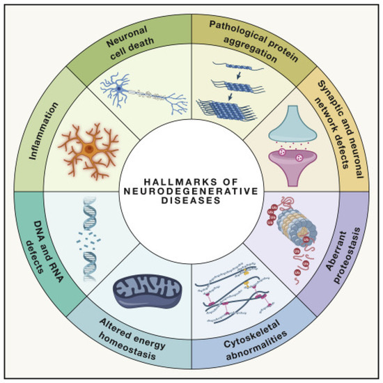 - Wilson, D.M., 3rd; Cookson, M.R.; Van Den Bosch, L.; Zetterberg, H.; Holtzman, D.M.; Dewachter, I. Hallmarks of neurodegenerative diseases. Cell 2023, 186, 693–714. [Google Scholar] [CrossRef]
