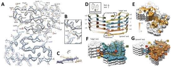 Structure of amyloid-β (1–42) peptide in fibrillar aggregates. (A) Atomic-resolution structure of Aβ1–42 superimposed with cryo-electron microscopy density map. (B) Inset shows a detailed view of the interactions between the -N and -C terminus (Asp1 and Ala42) with the side chains of Lys28. (C) Side view of the opposing subunits showing the relative orientation of the nonplanar subunits; the cross-β sheets are tilted by 10° with respect to the plane perpendicular to the fibril axis. (D) Side view of Aβ1–42 fibrils showing the staggered arrangement of the nonplanar subunits. (E) Surface representation of Aβ1–42 fibrils according to hydrophobicity (Kyte–Doolittle scale), orange–brown areas (hydrophobic, 4.5) to white (neutral, 0.0). (F) Surface view of the “ridge” fibril ends. (G) Surface views of the “groove” fibril ends. Reproduced with permission from [9].