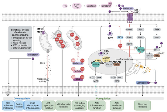 Melatonin signaling mechanisms: Melatonin shows receptor-mediated and receptor-independent activity and interacts with a variety of cellular signaling pathways. Both MT1 and MT2 are members of the GPCR receptor family. Melatonin binding and signaling involve several effectors, including PKC, PLC, and PKA, as well as downstream signaling pathways. Melatonin can also enter the cell through passive diffusion and transporters, where it activates mitochondrial receptors or cytosolic quinone reductase 2 (MT3), which in turn activates nuclear receptors ROR/RZR. Melatonin causes a shift towards an anti-inflammatory and antioxidant response and the preservation of mitochondrial and neuronal integrity. (Abbreviations: 5-OH-Trp, 5-Hydroxytryptophan; AMK, N1-acetyl-5-methoxykynuramine; AFMK, N1-acetyl-N2-formyl-5-methoxykynuramine; Akt, protein kinase B; COX, cyclooxygenase; CREB, cAMP response element-binding protein; Cyt, cytochrome c; ETC, electron transport chain; GPX, glutathione peroxidase; HO, heme oxygenase; IκB, Inhibitory-kappa B; iNOS, inducible nitric oxide synthase; KEAP1, Kelch-like ECH-associated protein 1; LOX, lipoxygenase; MAPK, mitogen-activated protein kinase; MPO, myeloperoxidase; mPTP, mitochondrial permeability transition pore; MT1/2/3, melatonin receptors 1/2/3; mtDNA, mitochondrial DNA; NF-κB, nuclear factor- kappa B; Nrf2, nuclear factor erythroid 2-related factor 2; PI3K, phosphoinositide 3-kinase; PKA, protein kinase A; PGC-1α, peroxisome proliferator-activated receptor gamma coactivator 1-alpha; PKC, protein kinase C; PLC, phospholipase C; RNS, reactive nitrogen species; ROR/RZR, retinoid acid receptor-related orphan receptor/retinoid Z receptor (RZR); ROS, reactive oxygen species SIRT1, sirtuin-1; SOD, superoxide dismutase; Trp, tryptophan).