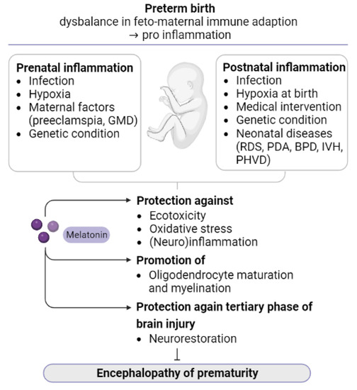 Neuroprotective and neurorestorative effects of melatonin: Prenatal and postnatal risk factors are associated with increased inflammation, which causes injury to the developing brain. Melatonin exerts its neuroprotective effects by reducing excitotoxicity, oxidative stress, and inflammation (acute and chronic), as well as by promoting oligodendroglial maturation and myelination. (Abbreviations: GMD, gestational diabetes mellitus; RDS, respiratory distress syndrome; PDA, patent ductus arteriosus; BPD, bronchopulmonary dysplasia; IVH, intraventricular hemorrhage; PHVD, posthemorrhagic ventricular dilatation).