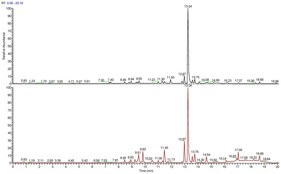 The LC-HRESIMS/MS (Figure 1) analyses of the studied extracts led to the separation and annotation of the most constituents; overall, 14 components (Table 1) were identified as belonging to two representative classes of constituents: flavonoids (peaks 1, 2, 4–9) and terpenoids (peaks 10–14). Rosmarinic acid (peak 3) at tR 8.94 min was the only identified hydroxycinnamic derivative.